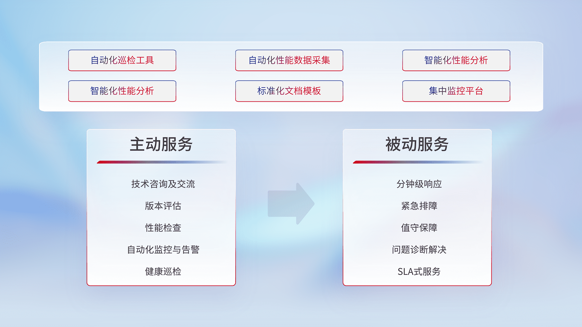 智能化工具和标准化文档,,保障服务质量,,提供主动服务(包含技术咨询、、、版本评估、、性能检查、、自动化监控与告警、、、、健康巡检)和被动服务包含(分钟级响应、、、、紧急排障、、、值守保障、、问题诊断解决、、、SLA服务)。。